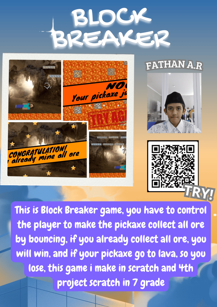 i make this game in scratch, this game is about collecting ore in top using player, you can control player to right and to left, and the pickaxe will bouncing and collect all the ore, if you collect all of the ore, so you win, but if your pickaxe fell to lava, so you lose. if you lose you can repeat the game again because the game is fun and not boring.