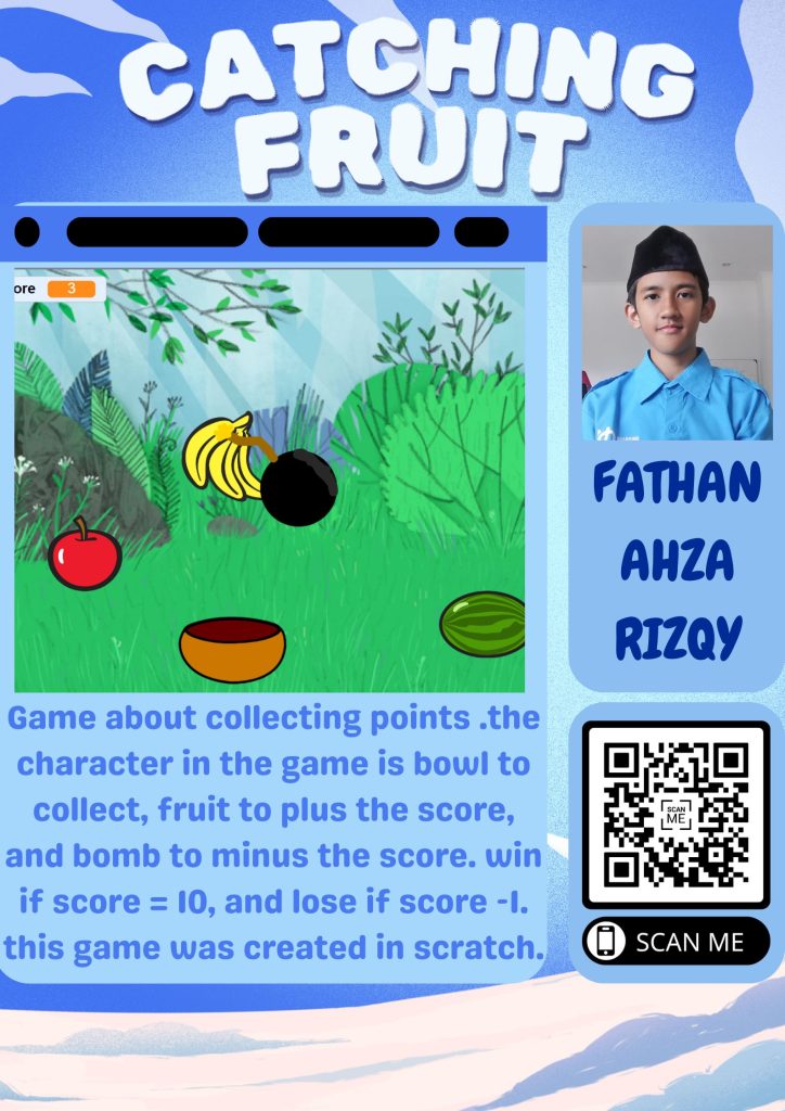 this game was created by me with scratch, this game is about catching fruit and avoid getting bomb, if you get the fruit you will get point, and if you get bomb, your point will reduce. you will win if your point is 10 and you will lose if yore point above 0, you can control bowl to catching fruit with keyboard left arrow to go left and right arrow to go right.