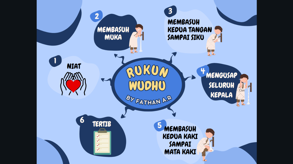 i make this poster with canva, this mind mapping is about rukun wudhu, there are 6 rukun wudhu in islam religion, and the point is already in my mind mapping. the first rukun wudhu is niat, second is wash face, third is wash two hand until elbow, fourth is wash half a head, fifth is wash legs, sixth is orderly.
