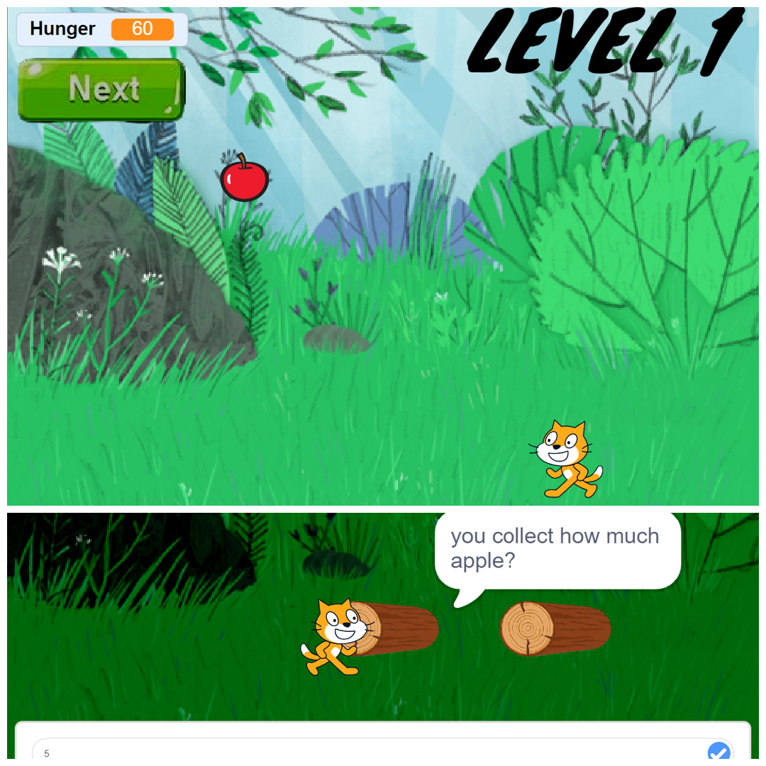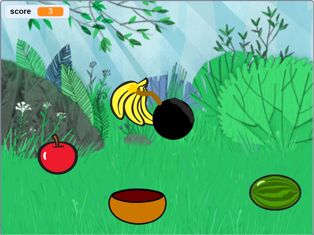 For our first Scratch project, we created a game called Catching Fruits. The way this game works is to just catch the falling fruit