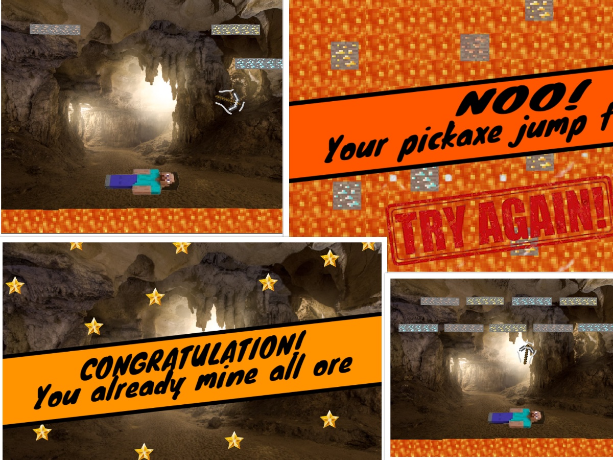 This game is about mining ore with control the player to bounce the pickaxe and collect the ore, collect all the ore to win.