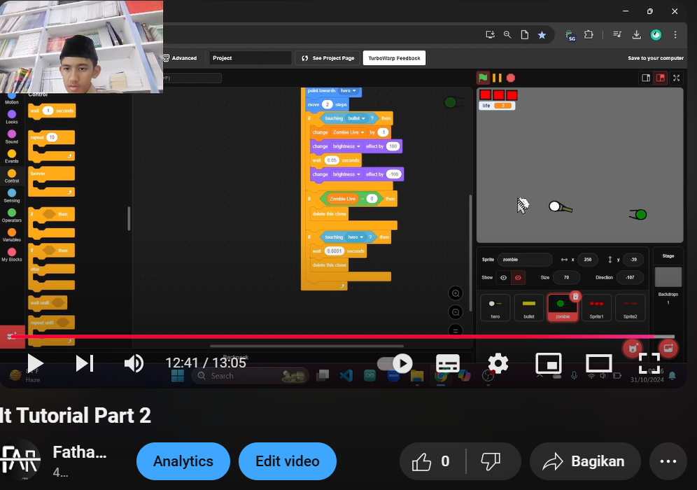 this is youtube project about tutorial zombie shooter in scratch, this video have 2 episode becouse time limit