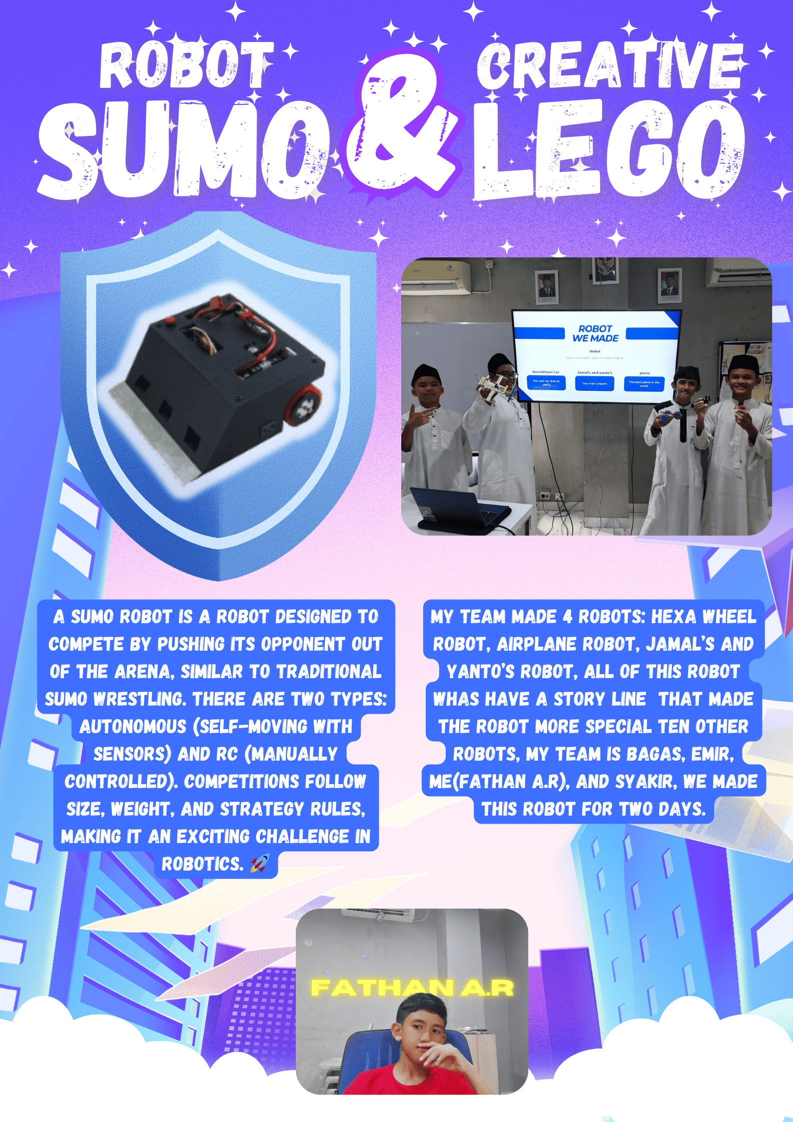 sumo competition project and lego project, we made a few robot from robotic legos.