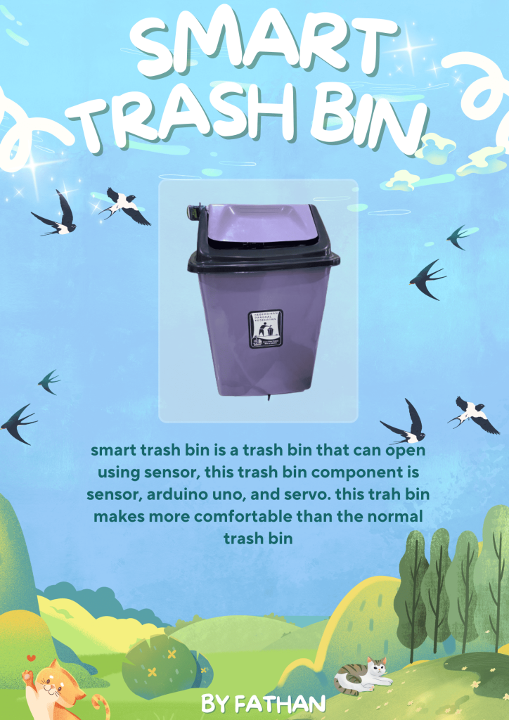 Smart Trash Bin is an automatic trash bin that can open using infrared sensor, so to open the thar bin you can not touch the bin and make your hand still clean. this automatic trash bin make it more comfortable than the normal trash bin. the component we use in this trash bin is an infrared sensor to detect your hand, an servo to open the trash bin, arduino uno chip to code with a pictoblox and a wire to connect sensor, arduino, and servo toghether, so all the component will connected with the wire.